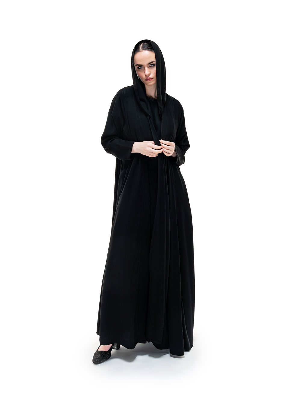 The design features a flowing open cut with a subtle hood for a modern twist, allowing versatility in styling for both casual and formal occasions. Its minimalistic yet refined look makes it the perfect choice for evening gatherings, special events, or daily wear when paired with understated accessories.